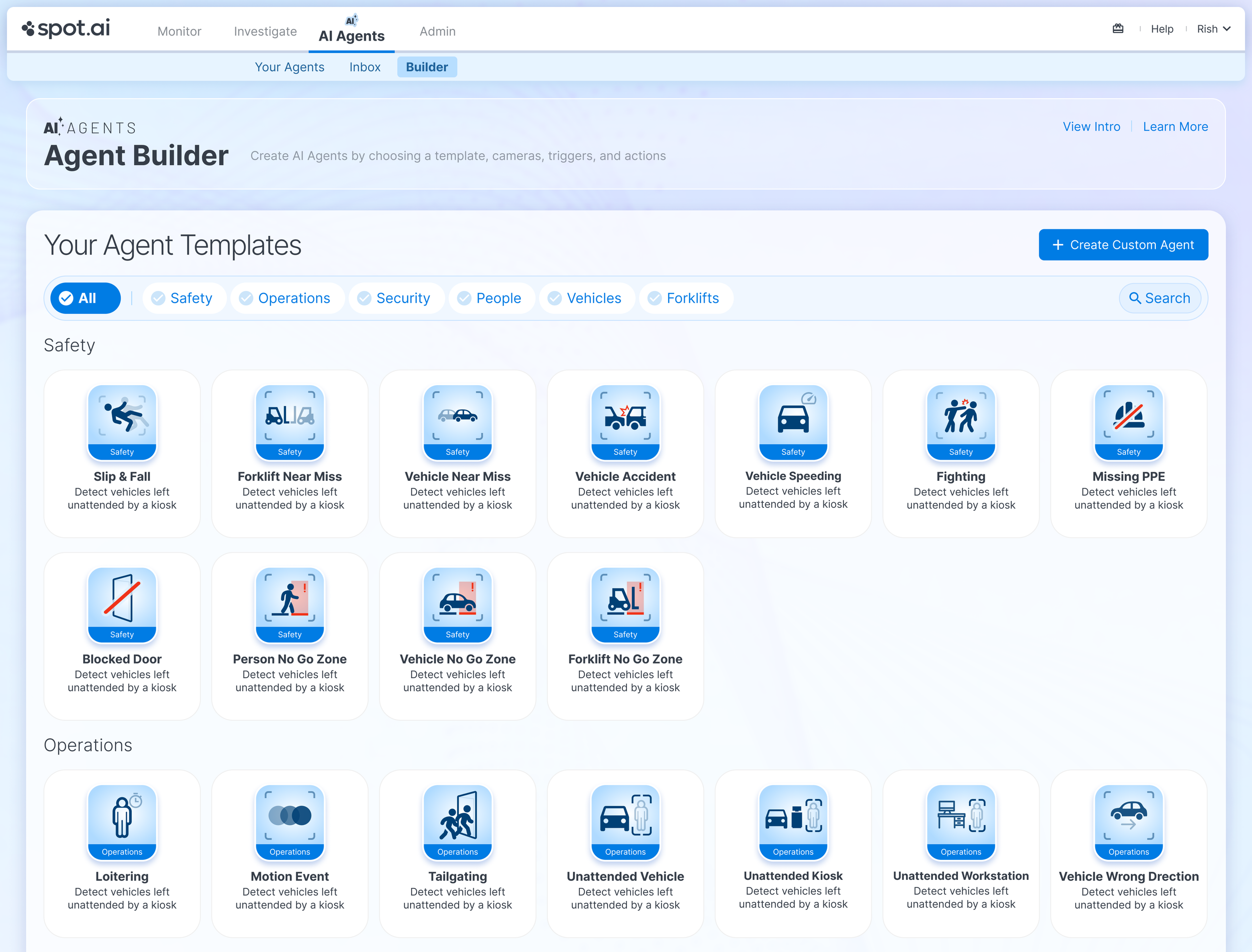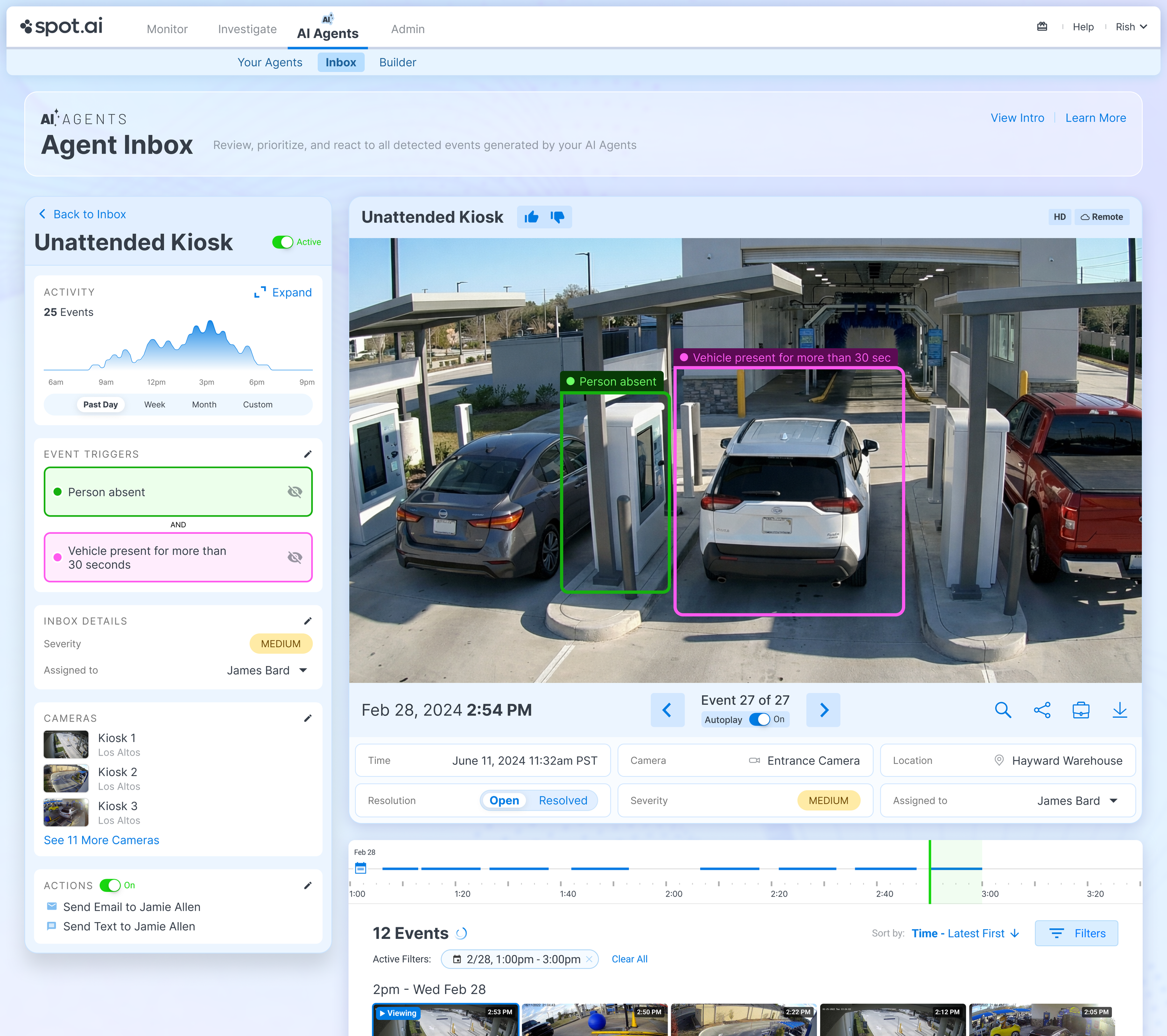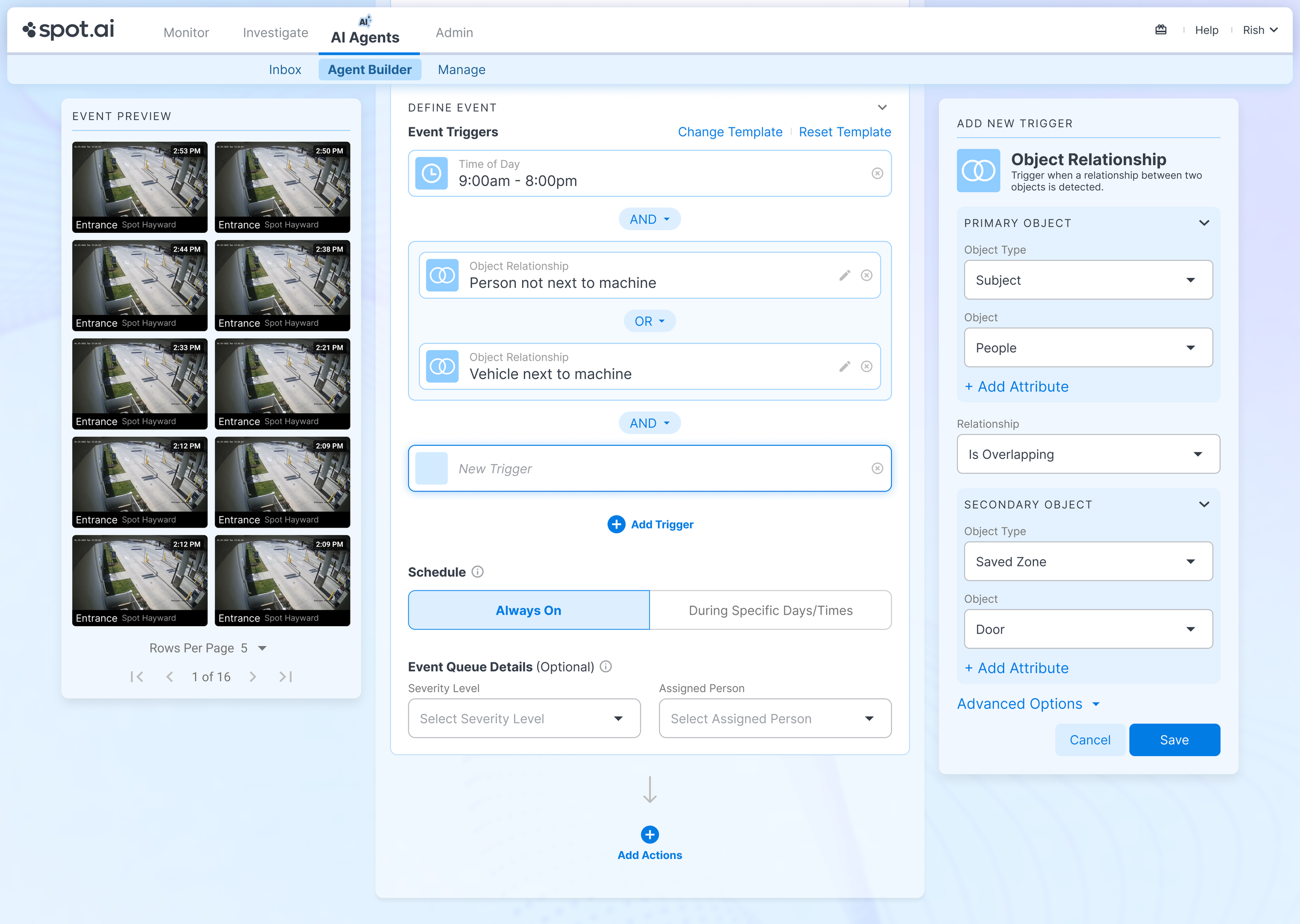 The result was a full AI Agents platform built from the ground up. It included a library of templates for common safety, operations, and security use cases, a flexible event builder for defining triggers and schedules, and a structured workflow that connected detections directly to automated actions. An inbox and event review system surfaced detected incidents, context, and resolution states. The system turned AI detections into operational tools rather than passive alerts.