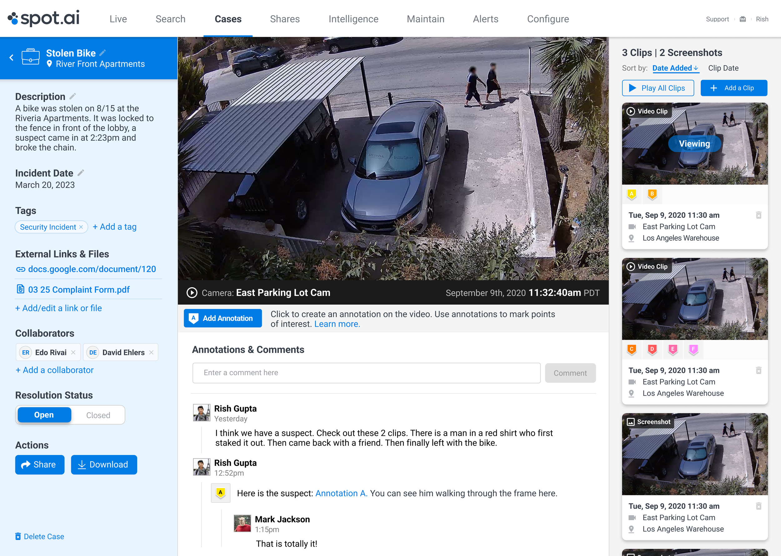 The feature included a Cases home where users could browse and filter incidents, a case detail view for documenting incident information and managing collaborators, and tools for adding clips, tags, external links, and files. Inside the video experience, users could create annotations and leave comments tied directly to specific moments. The system supported resolution tracking so teams could move cases from open to closed and maintain a record of investigation activity.